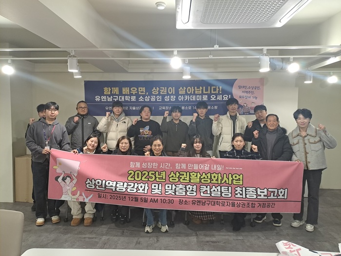 부산 남구 유엔남구대학로자율상권조합(이사장 양선명)이 추진한 2025년 상권활성화 사업 ‘상인역량강화 및 맞춤형 컨설팅’이 지난 5일 용소랑(상권활성화 거점공간)에서 열린 최종 보고회를 끝으로 올해 모든 일정을 성공적으로 마무리했다고 9일 전했다.