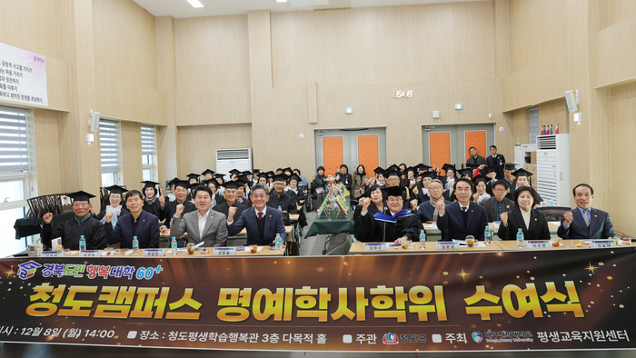 [대한경제=채종갑 기자]청도군은 8일 청도평생학습행복관 다목적강당에서 수강생과 내빈 등 60여 명이 참석한 가운데 ‘2025 경북도민행복대학 청도군 캠퍼스 명예학위 수여식’을 성황리에 개최했다.
