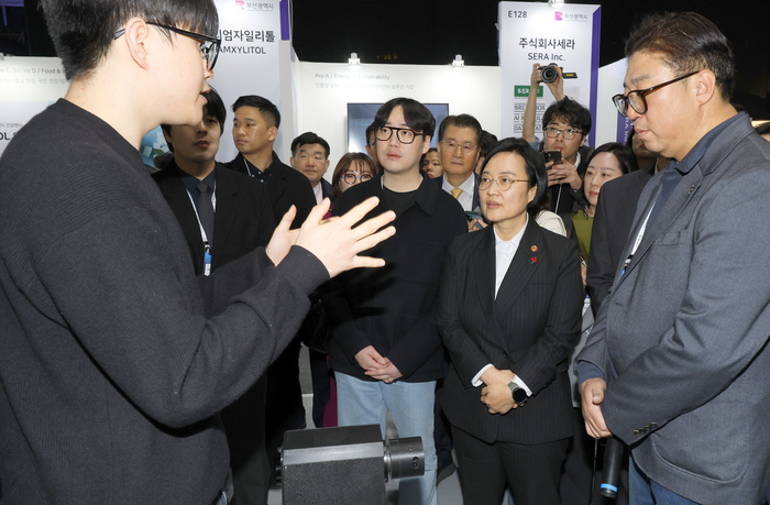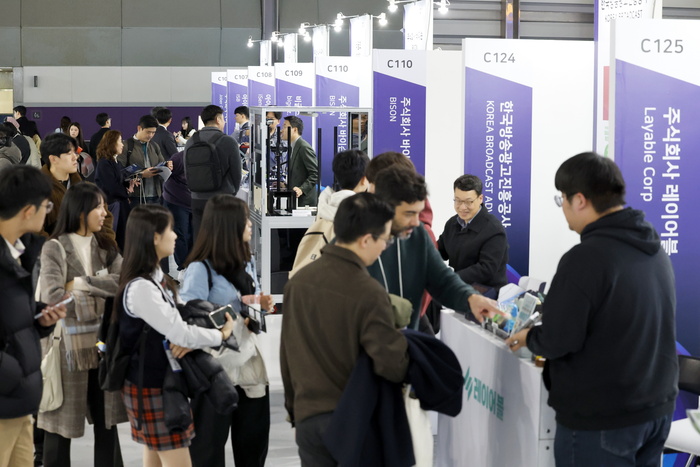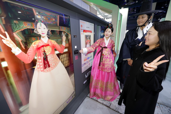 중소벤처기업부 주최로 10일 서울 강남구 코엑스에서 열린 '컴업 2025'에서 관람객들이 증강현실(AR) 한복체험을 하고 있다.
