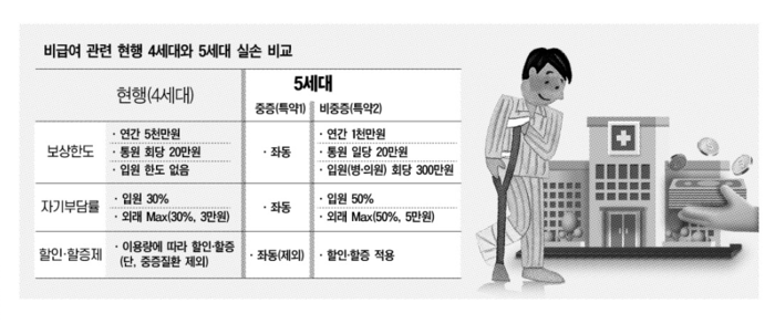 구체적으로 비중증 비급여 진료를 보장받을 때 자기부담률이 50%로 상향조정되고, 보상한도는 일당 20만원으로 내려간다. 도수치료나 비급여 주사제는 실손보험 보장 대상에서 아예 제외된다. 과잉 우려가 큰 비급여 진료는 보건당국이 관리급여로 지정하면 본인부담률이 95%로 높아진다.