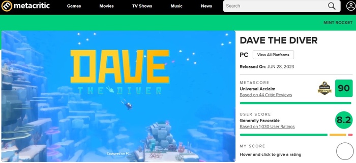 | 넥슨 자회사 민트로켓의 ‘데이브 더 다이버’는 글로벌 평가 사이트 메타크리틱에서 평점 90점을 기록 중이다. / 사진: 넥슨 제공 |