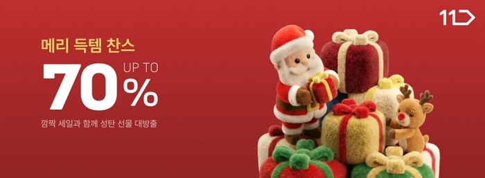11번가가 25일까지 장난감부터 뷰티·디지털까지 크리스마스 선물 상품을 최대 70% 할인 판매한다. 레고ㆍ뽀로로ㆍ빌리프 등 20개 브랜드가 기간별로 특가에 참여한다. 카카오ㆍ토스페이 7% 할인과 T멤버십 11% 할인 등 중복 혜택을 제공한다. 뽀로로ㆍ타요 장난감을 15% 즉시 할인에 카드사 5% 추가 할인하고, 레고는 최대 30% 할인에 12월 최다 구매 고객에게 40만원 상당 제품을 증정한다.