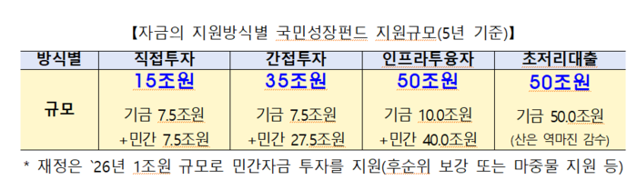 한편, 국민성장펀드의 투자처는 내년 초 여러 분야에서 각각 대표 프로젝트를 선정 및 발표된다. 에너지 분야와 반도체 분야, 인프라 분야 등이다. 현재 직접투자 수요로 차세대 AI솔루션 소프트웨어 개발업체, AI로봇 생태계를 위한 SPC 설립, 중소기업의 반도체용 특수가스 공장 증설을 위한 증자 등이 접수된 것으로 전해졌다.