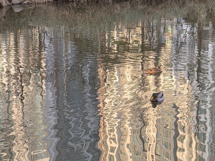 | 수면에 아파트가 반사된 홍제천에 청둥오리 한쌍이 여유롭다. |