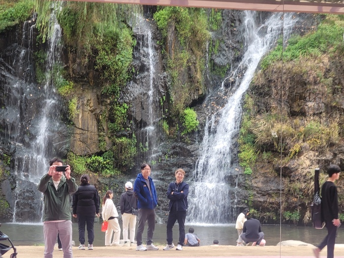 | 홍제폭포를 비추는 거울 벽 앞에서 사진 찍는 사람들. |