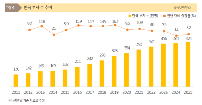 14일 KB금융지주 경영연구소가 발간한 ‘2025 한국 부자 보고서’에 따르면 한국 부자는 지난 15년간 매년 9.7% 증가했다. 총인구 중 한국 부자가 차지하는 비중은 2011년 0.27%에서 2016년 0.41%, 2020년 0.68%, 2022년 0.82%, 2025년 0.92%로 꾸준히 증가했다.