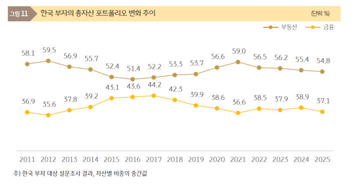 한국 부자의 자산 중 가장 큰 비중을 차지하는 부동산자산은 추세적으로 감소하고 있었다. 부동산 자산은 2011년 58.1%와 2012년 59.5%로 총자산의 절반 이상을 차지했다가, 2015년부터 2018년까지 51~53% 수준으로 비중이 줄었다. 팬데믹 기간 부동산 가격이 상승하면서 자산 비중이 증가했으나 2022년 이후 다시 하락해 2025년에는 총자산의 54.8%를 차지했다.