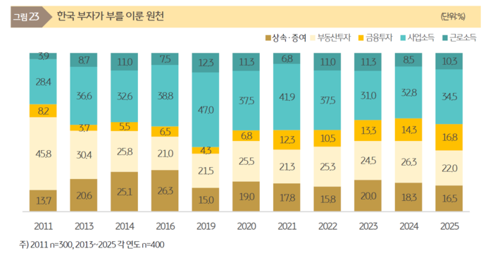 보고서에 따르면 2025년 한국 부자가 부를 이룬 주된 원천으로 꼽은 1순위는 ‘사업소득’(34.5%)이었고, 다음으로 ‘부동산투자’에 따른 이익(22.0%), ‘금융투자’에 따른 이익(16.8%), ‘상속·증여’(16.5%), ‘근로소득’(10.3%)의 순이었다.