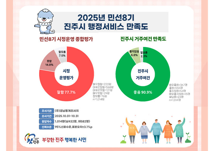 [대한경제=김옥찬 기자] 진주시가 실시한 ‘2025년 행정서비스 만족도 조사’에서 진주시 민선 8기 시정 운영에 대해 응답자의 77.7%가 ‘잘하고 있다’고 평가했다고 15일 밝혔다.
