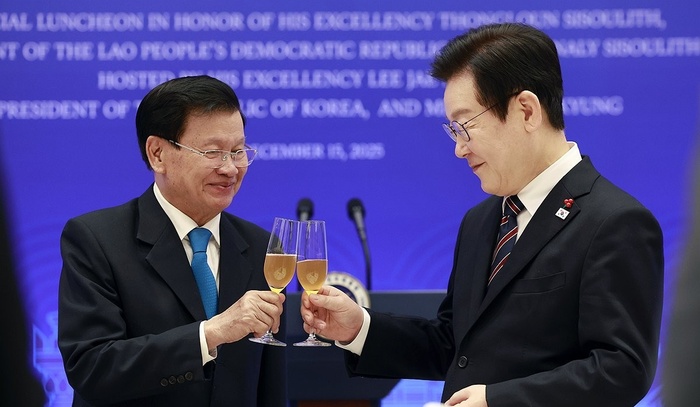 | 이재명 대통령이 15일 용산 대통령실에서 열린 한-라오스 공식오찬에서 통룬 시술릿 라오스 국가주석과 건배하고 있다./사진:연합뉴스 |