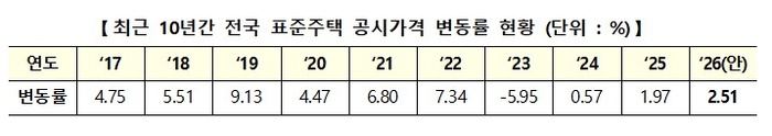 그 결과 내년 표준 단독주택 공시가격은 전국 평균으로 2.51% 올랐다. 올해(1.97%)보다 상승폭이 확대됐으며, 지난 2022년 7.34%가 오른 이후 4년만에 최대 상승폭이다.
