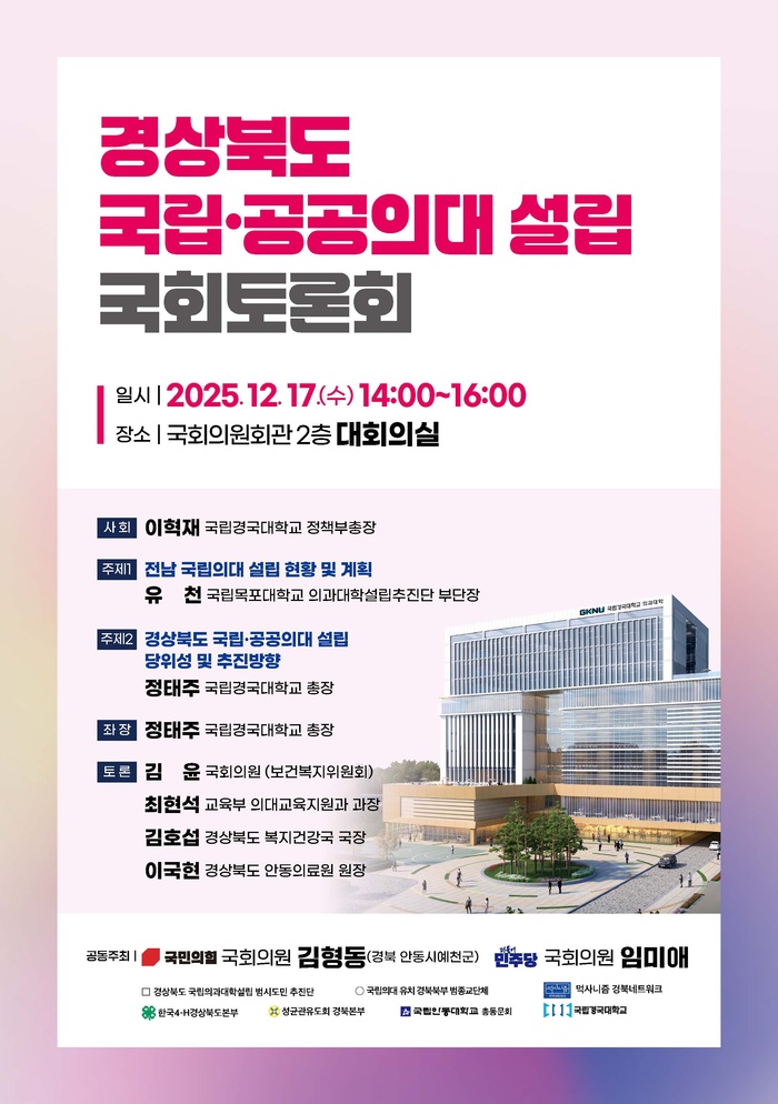 토론회에서는 유천 국립목포대 의대설립추진단 부단장이 ‘전남 국립의대 설립 현황과 추진 전략’을, 정태주 국립경국대 총장이 ‘경북 국립의대 설립의 필요성’을 주제로 발표했다. 이후 김윤 의원, 최현석 교육부 의대교육지원과장, 김호섭 경북도 복지건강국장, 이국현 안동의료원장 등이 참여해 지역 간 의사 불균형 해소와 필수의료 강화 방안을 놓고 토론을 벌였다.
