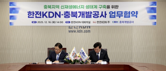 [대한경제=황은우 기자] 충북개발공사는 지난 16일 한전KDN과 함께 ‘충북지역 신재생에너지 생태계 구축을 위한 신재생에너지(태양광) 공동사업 추진’ 업무협약(MOU)을 체결했다고 17일 밝혔다.