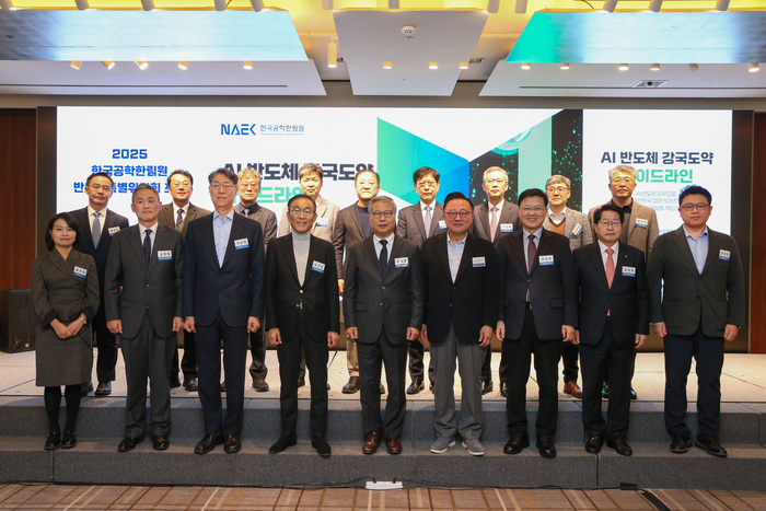 | 한국공학한림원 반도체특별위원회 포럼 주요 참석자가 기념 촬영하고 있다./사진: 한국공학한림원 제공 |