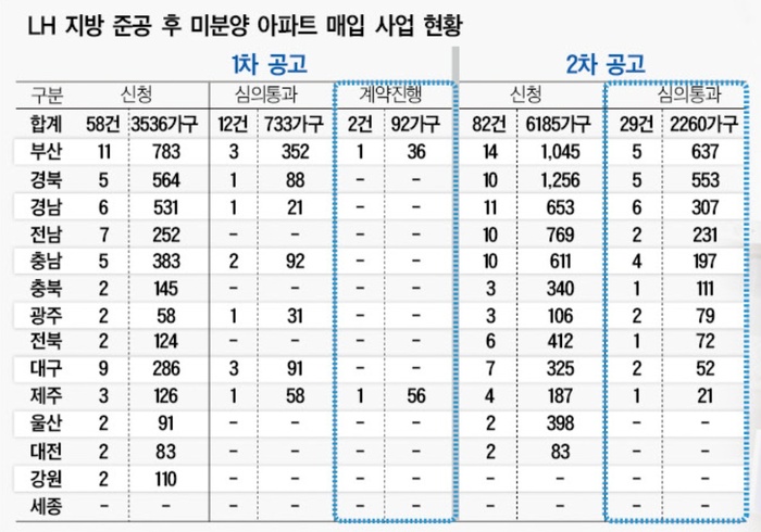18일 <대한경제> 취재를 종합하면, 최근 LH는 2차 사업에 접수된 6185가구(82개 단지)의 심의를 끝마치고 매입 대상을 광역자치단체 10곳의 2260가구(29개 단지)로 좁혔다. 부산이 637가구(5개 단지)로 최다였고 이후 △경북 553가구(5개 단지) △경남 307가구(6개 단지) △전남 231가구(2개 단지) △충남 197가구(4개 단지) △충북 111가구(1개 단지) △광주 79가구(2개 단지) △전북 72가구(1개 단지) △대구 52가구(2개 단지) △제주 21가구(1개 단지) 순이었다.