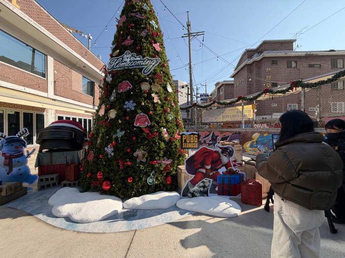 | ‘펍지 성수’ 중앙 마당에 7m 크기의 크리스마르 트리를 중심으로 포토존이 마련됐다. / 사진: 민경환 기자 |