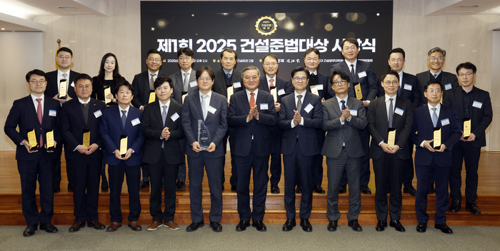 <대한경제>와 ‘1군 종합건설회사 법무직협의회(건법회)’ 주최로 18일 서울 강남구 건설회관에서 열린 ‘2025 건설준법대상’ 시상식에서 수상자들이 기념촬영을 하고 있다.
