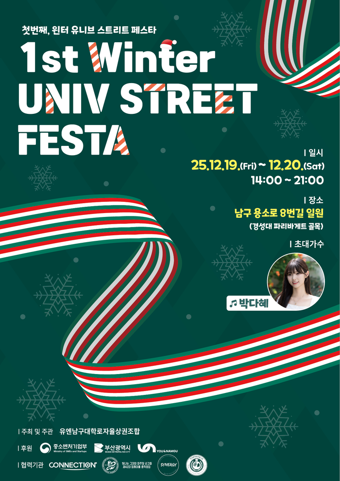 부산 남구 유엔남구대학로자율상권조합(이사장 양선명)은 겨울철 침체된 지역 상권에 활력을 불어넣기 위해 ‘제1회 윈터 유니브 스트리트 페스타(1st Winter UNIV STREET FESTA)’를 19일부터 20일까지 이틀간 남구 용소로8번길 일원(경성대 앞 파리바게트 골목)에서 개최한다고 밝혔다.