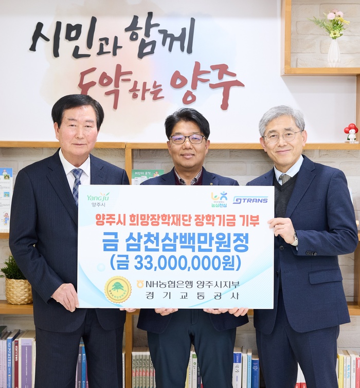 이진규 양주시희망장학재단이사장은 “NH농협은행 양주시지부와 경기교통공사의 따뜻한 마음과 의미 있는 나눔에 깊이 감사드린다”며 “이번 기부금은 학생들의 꿈과 희망을 지원하는데 소중히 쓰이게 될 것”이라고 감사의 인사를 전했다.