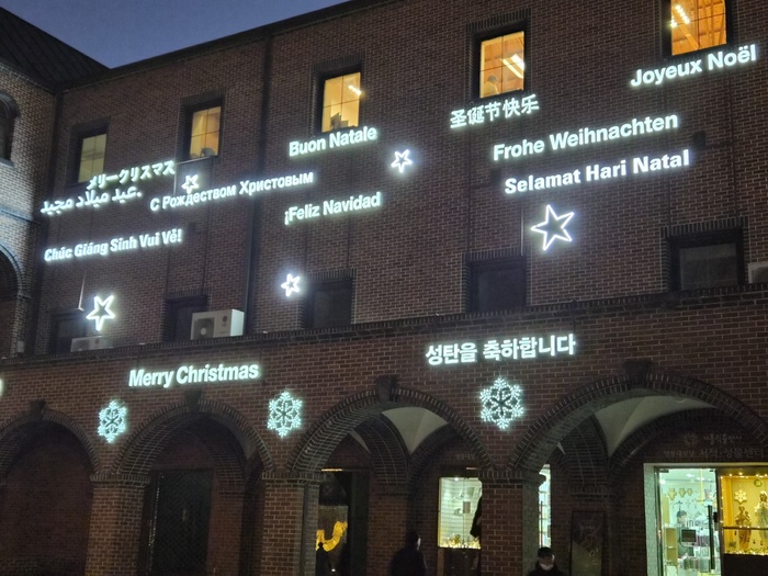 성경책이나 묵주 반지와 같은 천주교 성물들을 파는 건물 벽에는 성탄을 축하하는 다양한 언어들이 가득하다. 그러고 보니 주변에 다양한 인종의 외국인들이 많다. 다들 사진찍기에 바쁘다. 명동성당은 이제 명동 거리와 함께 서울의 유명 관광지가 됐나 보다.