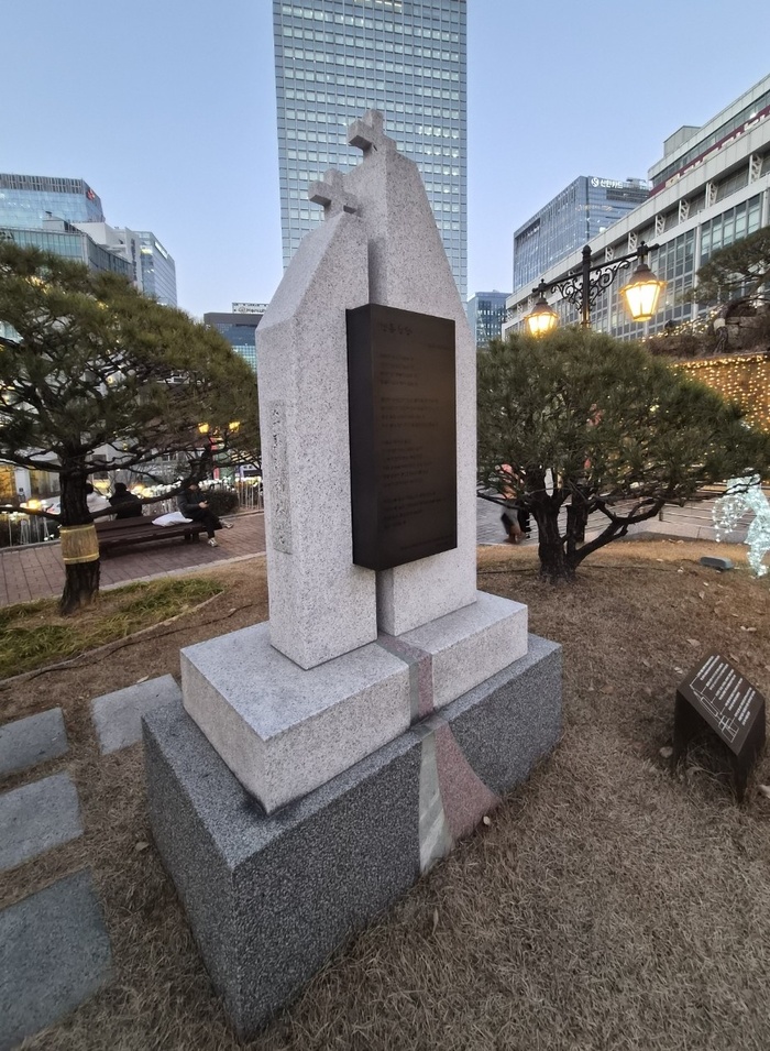 성당 초입에서는 김수환 추기경 탄생 100주년을 맞이해 세운 ‘명동성당’이라는 시비를 만날 수 있다. 정호승 시인은 ‘바보가 성자가 되는 곳’ ‘성자가 바보가 되는 곳’ ‘명동성당이 된 그 사나이’ ‘종을 잃은 종소리가 영원히 울려 퍼지는 곳’이라고 썼다.