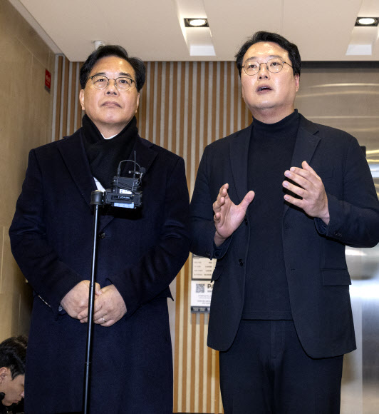 | 국민의힘 송언석(왼쪽) 원내대표와 개혁신당 천하람 원내대표가 21일 서울 여의도의 한 음식점에서 통일교 특검법 공동 발의 관련 오찬 회동을 마친 뒤 특검 관련 양당이 협의한 내용을 설명하고 있다./사진:연합 |