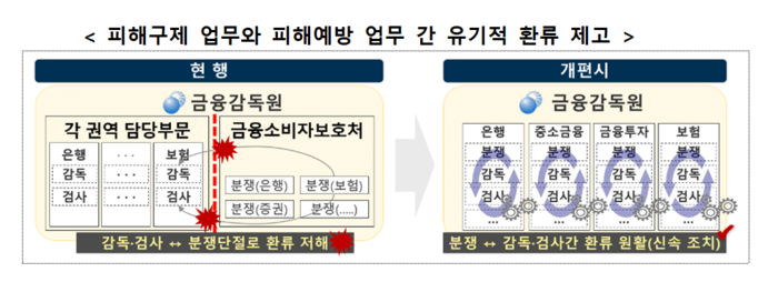 소비자 피해구제 수단인 분쟁조정 기능은 각 업권의 상품·제도 담당 부서(감독국)로 이관한다. 이에 따라 각 업권 담당 부문에서 상품심사부터 분쟁조정·검사까지 모든 과정을 일관되고 신속하게 운영하는 원스톱 대응 체제로 전환해 책임성·효과성이 높아질 것으로 기대된다.