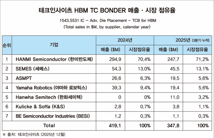 22일 반도체 시장조사기관 테크인사이츠에 따르면 한미반도체는 올해 3분기 누적 매출 2억4770만달러(약 3660억원)를 기록하며 71.2%의 시장 점유율로 1위를 차지했다.