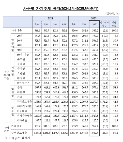 연령대별로는 30·40대에 대출이 집중됐다. 금액 기준 비중은 30·40대가 58.3%로 가장 높았다. 전분기 대비 차주당 대출 취급액도 30대는 243만원, 40대는 72만원 늘어난 반면, 20대(-70만원), 50대(-87만원), 60대 이상(-103만원)은 감소했다.