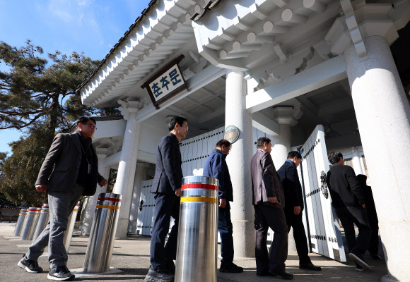 | 대통령실이 청와대에서 업무를 시작한 22일 기자들이 사용하는 춘추관으로 출입 기자들이 들어가고 있다. / 사진: 연합뉴스 |