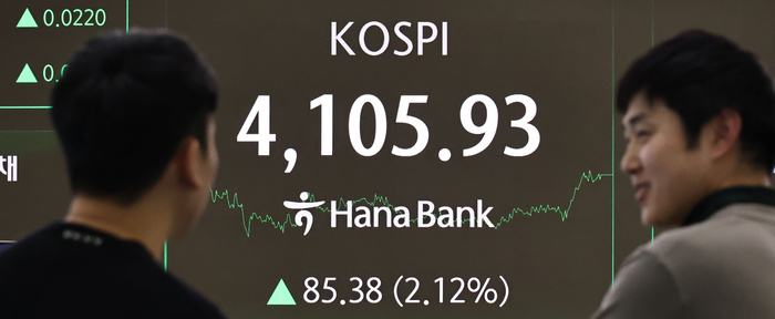 22일 코스피는 전 거래일보다 85.38포인트(pㆍ2.12%) 오른 4105.93에 장을 마감했다. 지수는 4096.26으로 출발해 상승세를 이어갔다. 코스피가 종가 기준 4100선을 넘어선 것은 지난 12일(4167.16) 이후 6거래일 만이다.
