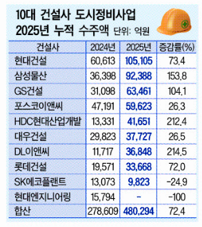 [대한경제=한형용 기자] 2025년 국내 도시정비사업 시장이 역대 최대 규모로 폭발했다. 올해 전국 정비사업 수주액 규모는 64조원에 육박한 것으로 추산됐고, 이 가운데 10대 건설사의 수주액은 48조원 규모를 기록하며 2022년 42조원을 기록한 최대 실적 수치를 갈아치웠다. 특히 현대건설은 업계 최초로 연간 10조원을 돌파하며 ‘10조 클럽’ 시대를 열었다.