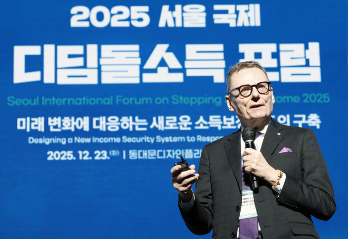 | 2024년 노벨경제학 수상자 제임스 A.로빈슨 교수가 23일 서울 동대문구 동대문디자인플라자(DDP) 아트홀에서 열린 2025 서울국제디딤돌소득포럼에서 기조연설을 하고 있다. |