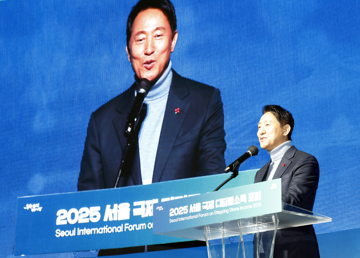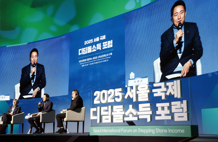| 오세훈 서울시장이 23일 서울 동대문구 동대문디자인플라자(DDP) 아트홀에서 열린 2025 서울국제디딤돌소득포럼 개회식에서 환영사를 하고 있다. |