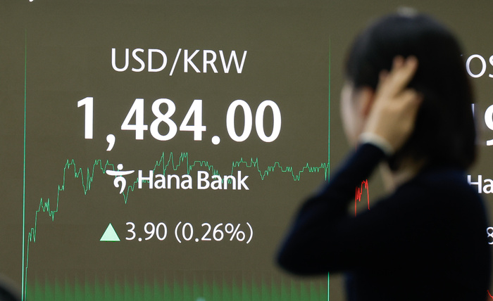 23일 서울 중구 하나은행 딜링룸 전광판에 원달러 환율이 1484.00원을 나타내고 있다. 원달러환율 1484원은 지난 4월9일(1487.6원) 이후 8개월여 만에 가장 높은 기록이다.