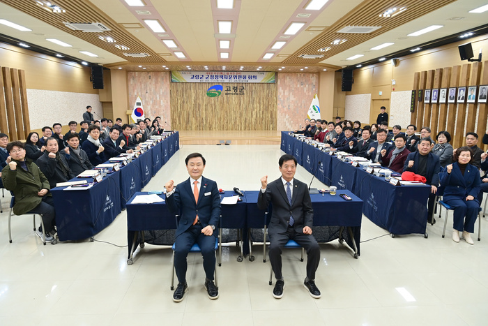 | 이남철 고령군수(앞줄 왼쪽)와 이철호 고령군의회 의장(앞줄 오른쪽)이 지난 23일 군청 대가야홀에서 열린 군정정책자문위원회 정기회의에 참석해 체류형 관광도시 전환과 조직혁신 방향을 논의했다. /사진:고령군 제공 |