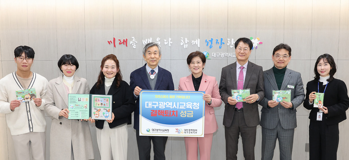 | 결핵퇴치사업 기금 조성을 위한 성금을 전달한 후 기념촬영을 하고 있다./사진 : 대구시교육청 제공 |