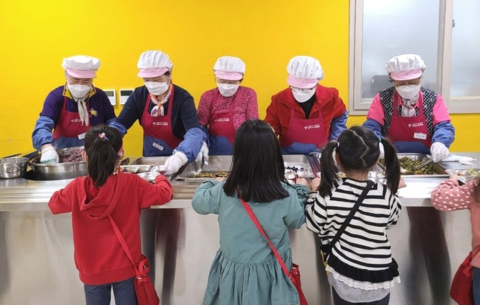 | 관악구 어르신 일자리 참여자들이 초등학교 급식 도우미로 활동하고 있는 모습. / 사진 : 관악구 제공 |