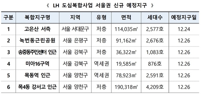 [대한경제=황은우 기자] 한국토지주택공사(LH)는 서울 목동역 등 총 6곳의 사업지가 도심 공공주택 복합사업(도심복합사업) 예정지구로 지정 공고됐다고 26일 밝혔다.