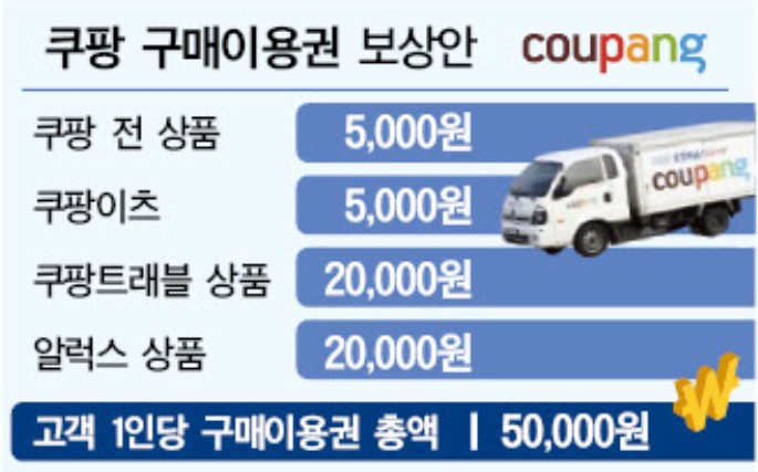 쿠팡은 이들에게 로켓배송ㆍ로켓직구ㆍ판매자로켓ㆍ마켓플레이스 등 쿠팡 전 상품(5000원), 쿠팡이츠(5000원), 쿠팡트래블 상품(2만원), 알럭스 상품(2만원) 등 고객당 총 5만원 상당의 1회 사용할 수 있는 4가지 구매 이용권을 지급한다.