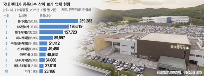 한편 올해 10월 말 기준 국내 렌터카 시장은 전체 1300여개사 중 상위 10개 업체가 70%를 점유하고 있다. 상위 10개사 중 7곳이 캐피털사 계열로, 합산 점유율은 34.8%다.