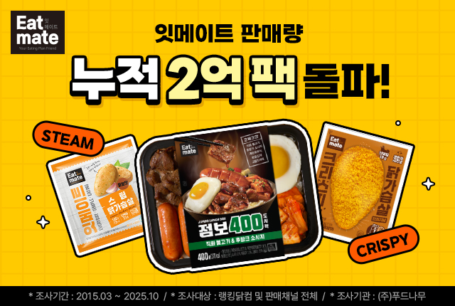 대표 제품군 역시 고른 성장세를 보였다. 잇메이트 제품 중 판매량 1위는 누적 약 3,900만 팩이 판매된 ‘훈제 닭가슴살’로, 출시 이후 오랜 기간 스테디셀러로 자리 잡았다. 2위 제품인 ‘스팀 닭가슴살’은 누적 약 3,000만 팩의 판매량을 기록하며 담백한 맛과 촉촉한 식감을 앞세워 안정적인 판매 흐름을 이어가고 있다.