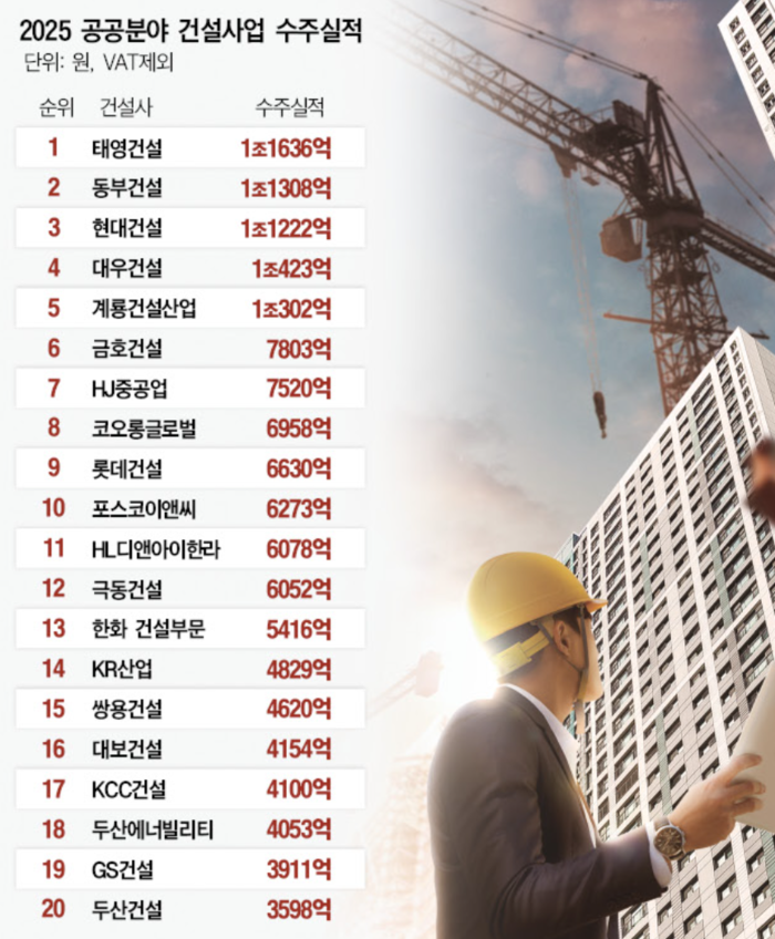 [대한경제=백경민 기자] 태영건설이 올해 공공건설 시장에서 1조1636억원을 수주하며 정상에 올랐다. 동부건설과 현대건설, 대우건설, 계룡건설산업도 1조원을 넘기며 ‘빅5’ 체제를 구축했다.