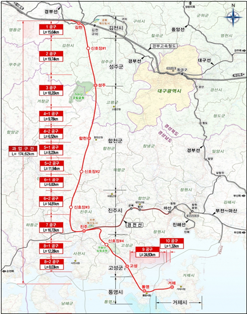 | 남부내륙철도(김천~거제) 건설사업 노반신설 기타공사 노선도 |