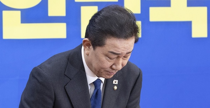 | 김병기 더불어민주당 원내대표가 30일 국회에서 열린 민주당 원내대책회의에서 본인 의혹 관련해 사퇴 의사를 밝힌 뒤 고개숙여 사과하고 있다./사진:연합뉴스 |