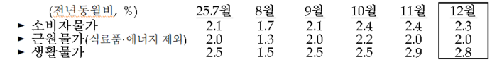 한편, 국가데이터처에 따르면 12월 소비자물가 상승률은 전년 동월 대비 2.3%로, 전월(2.4%)보다 0.1%p 하락했다. 10월과 11월에는 각각 2.4%를 기록한 바 있다.