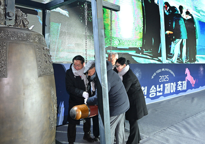 | 유정복 인천시장이 1일 인천문화예술회관에서 열린 '2025 인천 송년 제야축제'에서 시민대표들과 2026년 병오년(丙午年) 새해를 알리는 타종을 하고 있다. |