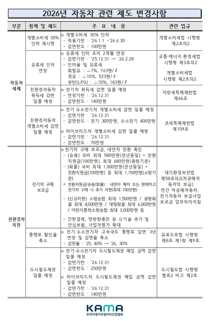[대한경제=강주현 기자] 한국자동차모빌리티산업협회(KAMA)가 2026년부터 달라지는 자동차 관련 제도를 발표했다.