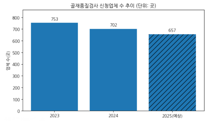 6일 한국골재산업연구원에 따르면, 골재 품질검사를 받은 정기검사 업체 수는 2023년 753곳에서 2024년 702곳, 2025년 657곳(예상)으로 3년 내내 감소세를 기록했다. 2년 새 약 13%에 달하는 96개 업체가 검사 시장에서 사라진 셈이다. 건설 경기가 악화일로를 걷기 시작한 시점과 정확히 맞물려 우하향 곡선을 그렸다.