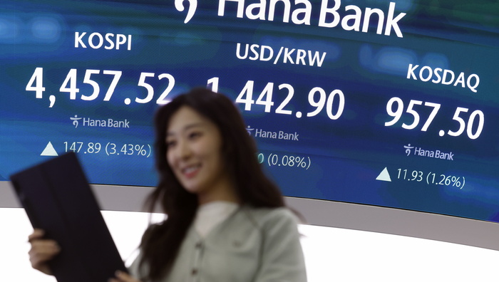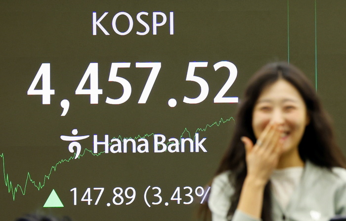 코스피가 반도체주 강세에 힘입어 4,450선을 넘서며 사상 최고치를 달성한 5일 서울 중구 하나은행 본점 딜링룸 현황판에 코스피 지수가 표시돼 있다. 이날 삼성전자 주가는 전 거래일 대비 7.47% 오른 13만 8100원에 거래를 마치며 종가 기준 사상 첫 13만 원 돌파에 성공했다. SK하이닉스 주가는 전 거래일 대비 2.81% 오른 69만 6000원에 거래를 마감했다.